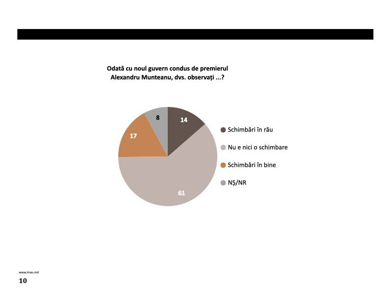 „Activitatea noului Guvern nu mișcă percepțiile votanților din RM. Mare parte dintre ei - 61% - spun că nu văd nicio schimbare odată cu acest nou Guvern. 14% văd schimbări în rău și 17% văd unele schimbări în bine”, a menționat directorul IMAS, Doru Petruți.