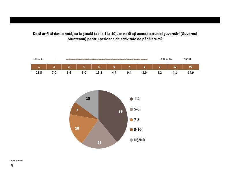 „Actualul Guvern nu ne oferă o agendă de activități prea bogată sau cât de cât interesantă, așa că am găsit cu greu măcar câteva direcții pe care să facem o evaluare a noului Executiv. În primul rând, chiar dacă au trecut cele 100 de zile, respondenții au fost rugați să acorde o notă noului Guvern Munteanu și după cum putem vedea, ponderea notelor de 9 și 10 este foarte scăzută - 7%, iar 18 la sută le au notele de 7 și 8, în timp ce, cea mai mare parte, două treimi dau fie note foarte dure - de la 1 la 4, fie note de trecere la limită, de la 5 sau 6 - 21%.