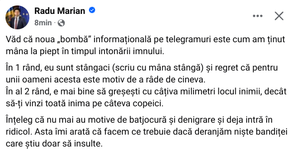 „Văd că noua „bombă” informațională pe telegramuri este cum am ținut mâna la piept în timpul intonării imnului.