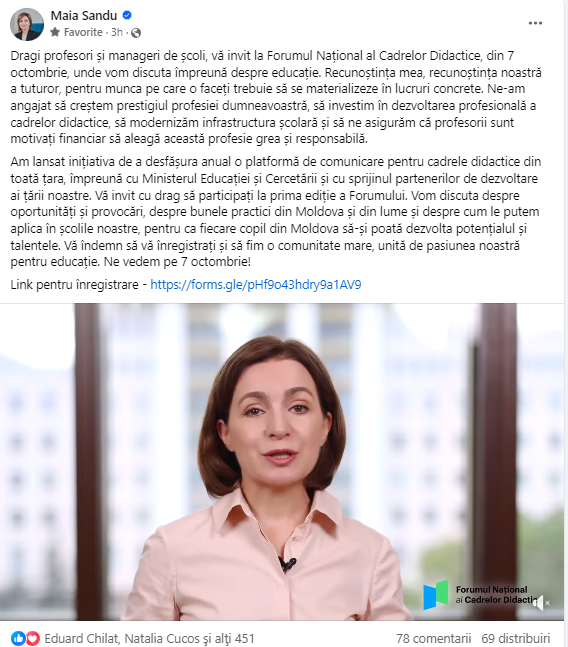 Am lansat inițiativa de a desfășura anual o platformă de comunicare pentru cadrele didactice din toată țara, împreună cu Ministerul Educației și Cercetării și cu sprijinul partenerilor de dezvoltare ai țării noastre. Vă invit cu drag să participați la prima ediție a Forumului. Vom discuta despre oportunități și provocări, despre bunele practici din Moldova și din lume și despre cum le putem aplica în școlile noastre, pentru ca fiecare copil din Moldova să-și poată dezvolta potențialul și talentele. Vă îndemn să vă înregistrați și să fim o comunitate mare, unită de pasiunea noastră pentru educație. Ne vedem pe 7 octombrie! ”, a punctat Maia Sandu.