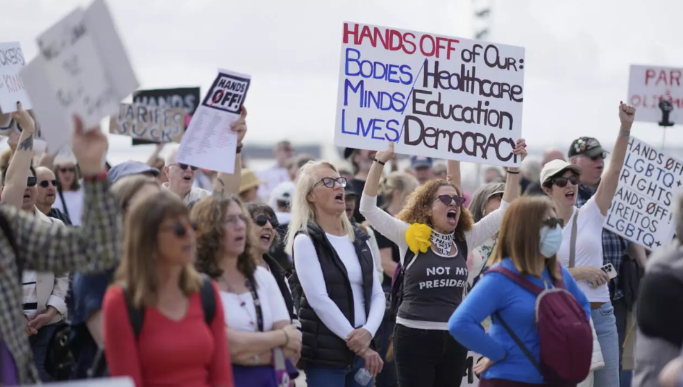 Adunaţi în Opernplatz din Frankfurt, membrii grupului Democraţii de peste mări au cerut demisia preşedintelui SUA, cu sloganuri pe pancarte pe care scria „Restauraţi democraţia”, „Jos mâinile de pe datele noastre personale” şi „Lumea s-a săturat de prostiile tale Donald, pleacă!”