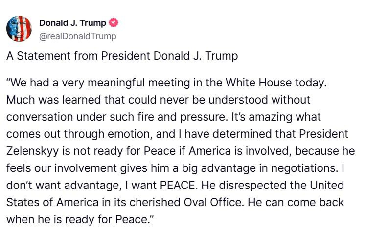 „Astăzi am avut o întâlnire foarte importantă la Casa Albă. Am aflat multe lucruri care nu ar putea fi înțelese niciodată fără o conversație sub presiune. Este uimitor ce poate ieși la suprafață prin emoții și am realizat că președintele Zelenski nu este pregătit pentru pace dacă America este de partea lui, deoarece el simte că implicarea noastră îi oferă un mare avantaj în negocieri. Eu nu vreau avantaj, eu vreau PACE. El a manifestat lipsă de respect față de Statele Unite ale Americii în prețiosul lor Birou Oval. Poate reveni atunci când va fi pregătit pentru pace”, a scris președintele SUA, Donald Trump, pe rețeaua sa de socializare Truth Social.