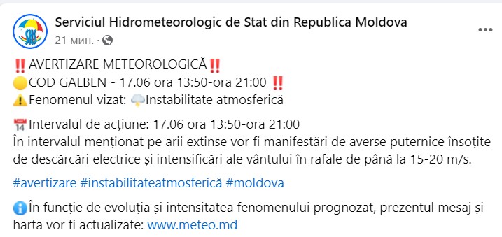 Serviciul Hidrometeorologic de Stat (SHS) a emis astăzi, 17 iunie, un cod galben de instabilitate atmosferică. Alerta este în vigoare de la ora 13:50 până la ora 21:00.