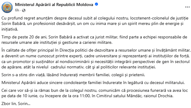 Ministerul Apărării aduce sincere condoleanțe familiei îndurerate în legătură cu decesul militarului.