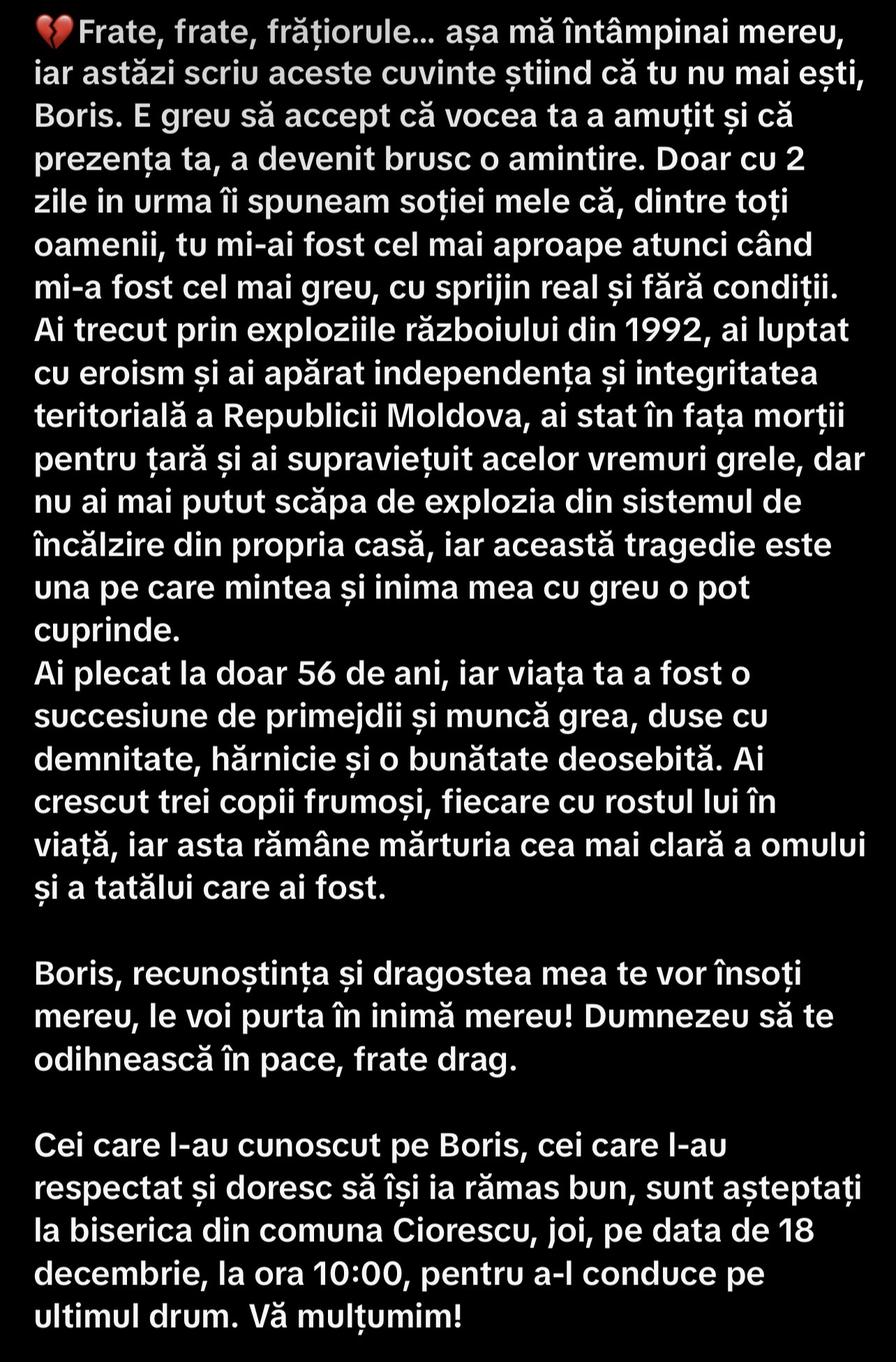 Bărbatul, care și-a pierdut viața în urma exploziei produse într-o locuință din comuna Ciorescu pe 14 decembrie, este fratele lui Teodor Cârnaț. Anunțul a fost făcut chiar de acesta, care a publicat un mesaj emoționant de adio pe rețelele sociale: „Boris, dintre toți oamenii, tu mi-ai fost cel mai aproape”.