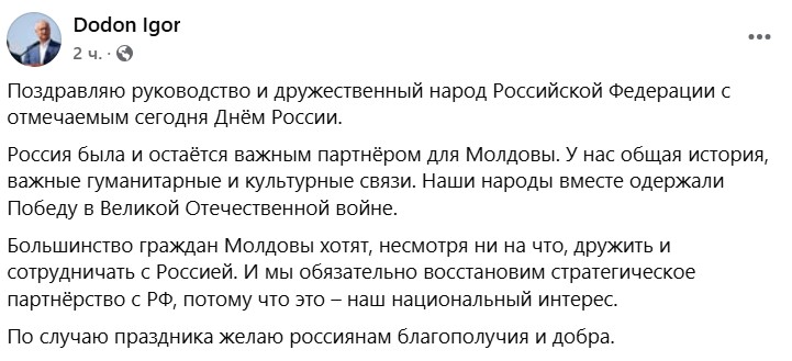 Fostul președinte al Republicii Moldova, Igor Dodon, a transmis un mesaj de felicitare conducerii și cetățenilor Federației Ruse cu ocazia Zilei Naționale, sărbătorită astăzi, 12 iunie. În mesajul său, liderul PSRM a subliniat importanța relațiilor bilaterale și a exprimat speranța că parteneriatul strategic va fi restabilit.