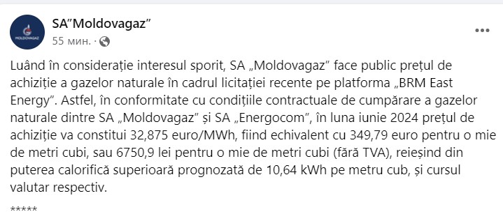 „Luând în considerație interesul sporit, SA „Moldovagaz” face public prețul de achiziție a gazelor naturale în cadrul licitației recente pe platforma „BRM East Energy”. Astfel, în conformitate cu condițiile contractuale de cumpărare a gazelor naturale dintre SA „Moldovagaz” și SA „Energocom”, în luna iunie 2024 prețul de achiziție va constitui 32,875 euro/MWh, fiind echivalent cu 349,79 euro pentru o mie de metri cubi, sau 6750,9 lei pentru o mie de metri cubi (fără TVA), reieșind din puterea calorifică superioară prognozată de 10,64 kWh pe metru cub, și cursul valutar respectiv”, comunică reprezentanții companiei.