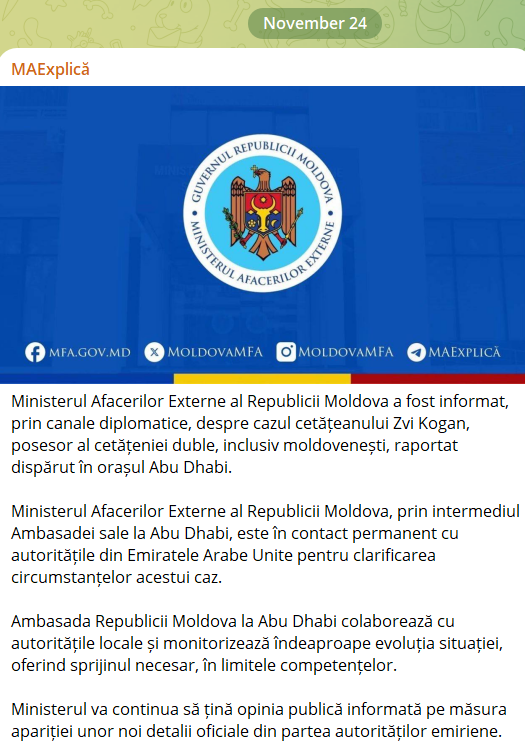 „Ministerul Afacerilor Externe al Republicii Moldova a fost informat, prin canale diplomatice, despre cazul cetățeanului Zvi Kogan, posesor al cetățeniei duble, inclusiv moldovenești, raportat dispărut în orașul Abu Dhabi.