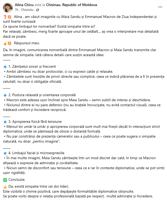 Răspunsul meu - Da, în imagini, comunicarea nonverbală dintre Emmanuel Macron și Maia Sandu transmite clar semne de simpatie. Iată câteva detalii care susțin această idee: