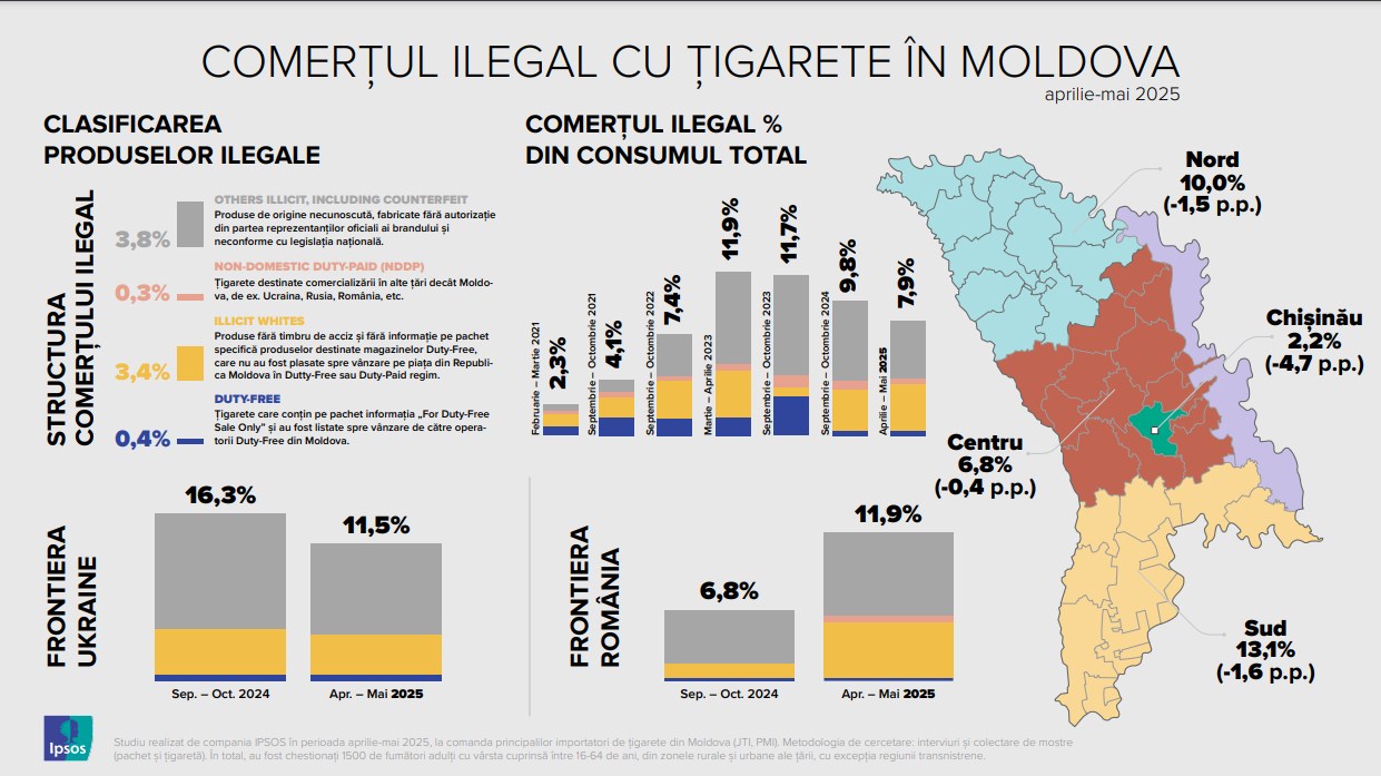 Studiul realizat de IPSOS în 2023 arată că, acum doi ani, comerțul ilicit în Republica Moldova ajunsese la un nivel record, de aproape 12%. În 2024, situația a început să se schimbe - piața ilegală s-a redus până la 9.8%, iar în acest an a consituit 7.9%. De menționat că noul calendar fiscal a intrat în vigoare în ianuarie 2024 și prevede o creștere graduală a accizei de 10% până la finele anului 2026.