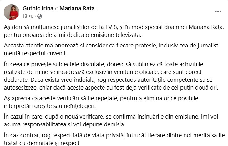 În caz contrar, rog respect față de viața privată, întrucât fiecare dintre noi merită să fie tratat cu demnitate și respect”, a mai scris Irina Gutnic într-o reacție pe facebook.
