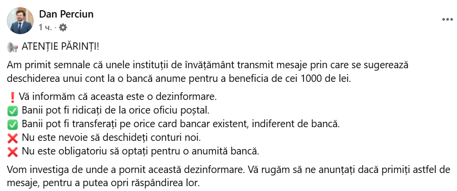 „Am primit semnale că unele instituții de învățământ transmit mesaje prin care se sugerează deschiderea unui cont la o bancă anume pentru a beneficia de cei 1000 de lei.