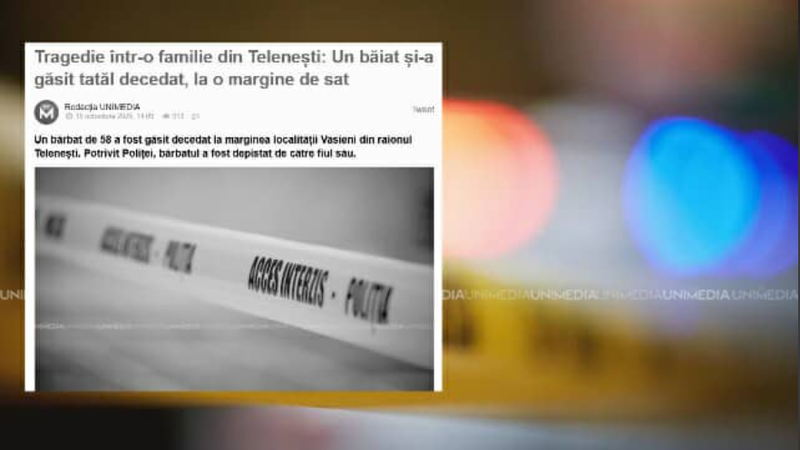 Pe 15 octombrie, un bărbat de 58 a fost găsit decedat la marginea localității Vasieni din raionul Telenești. Potrivit Poliței, acesta a fost depistat de către fiul său.