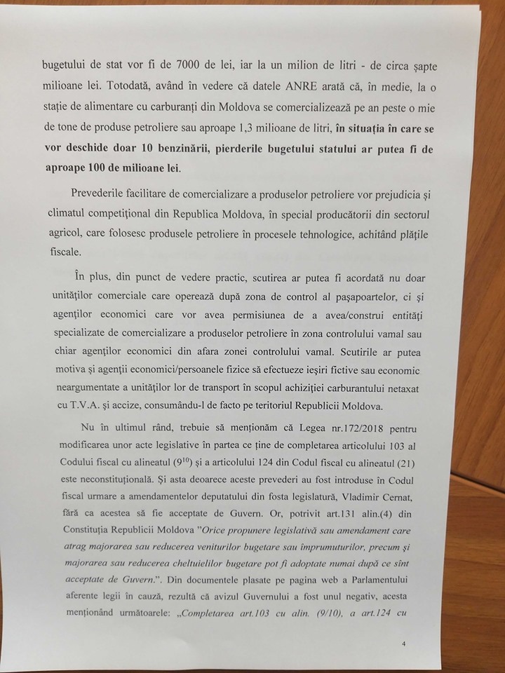 3) LEGEA GENEREAZĂ PREJUDICII MAJORE BUGETULUI DE STAT. Conform unor calcule efectuate de jurnaliștii de la Mold-street, în situația în care se vor deschide doar 10 benzinării, pierderile bugetului statului ar putea fi de aproape 100 de milioane lei. Astfel, prejudiciile bugetare urmare implementării acestei legi vor fi enorme, de ordinul miliardelor de lei”.