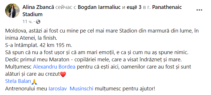 Dedic primul meu Maraton - copilăriei mele, care a visat îndrăzneț și mare”, a scris Alina Zbancă într-un mesaj postat pe pagina sa de Facebook.