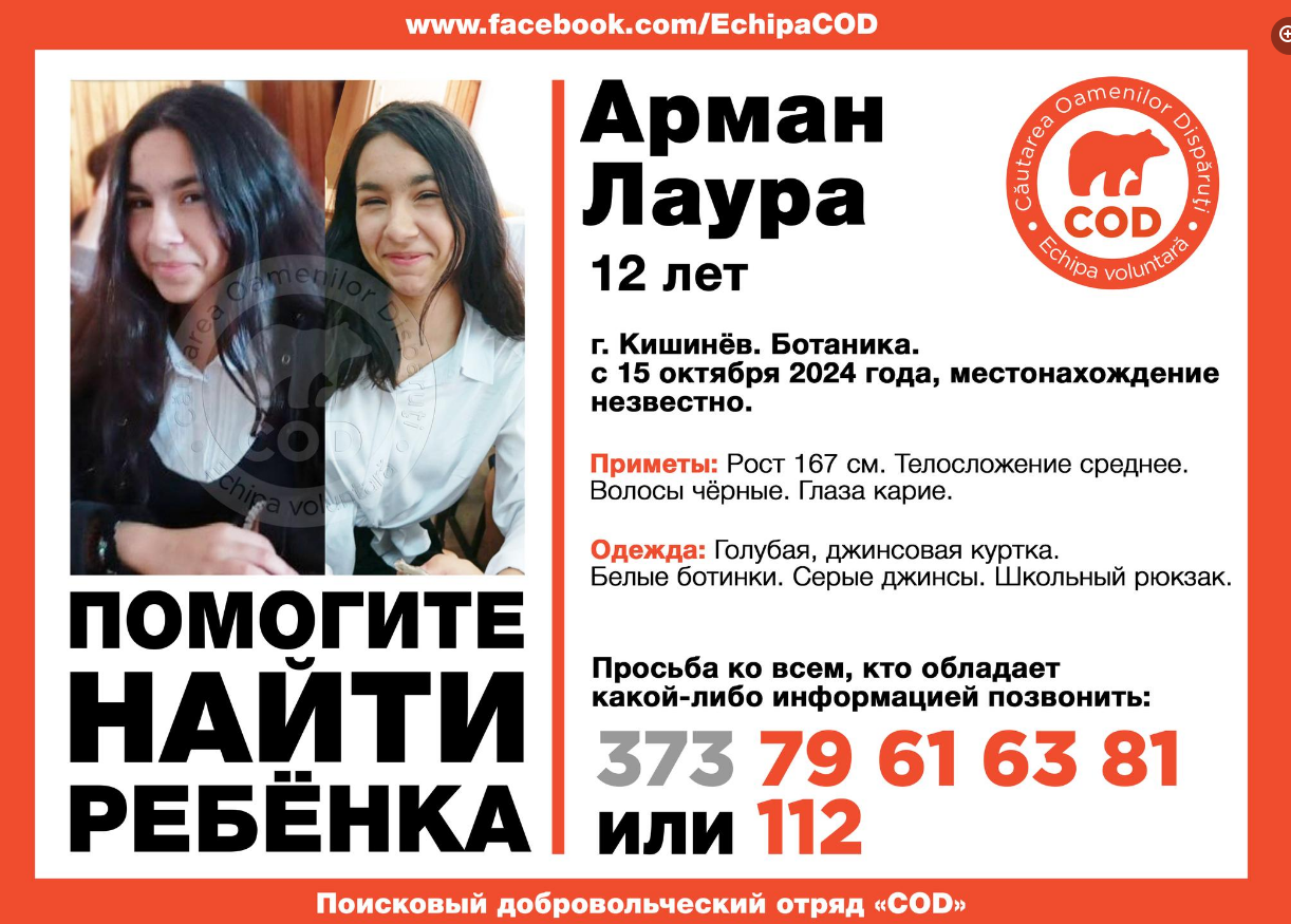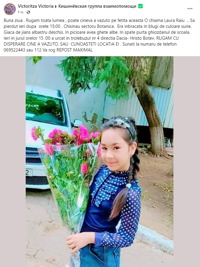 „Laura Raiu s-a pierdut ieri, 15 octombrie, după ora 15:00, în sectorul Botanica al capitalei. La momentul dispariției era îmbrăcată în blugi de culoare surie, geacă de jeans de culoare albastru deschis și purta ghete albe, iar în spate avea ghiozdanul de școală.