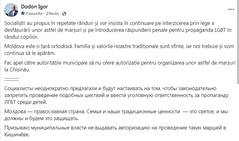 Anul trecut, Igor Dodon a fost citat la poliție după declarații „privind propaganda LGBT”. „Plângere din partea celor mai mari P… Druji sau padruji, naiba știe. Lasă să mă cheme în judecată și pentru asta, dar noi suntem împotriva promăvării LGBT în școli și grădinițe. Numai am postat că am fost vizat, s-a început o gălăgie. Trebuia să fiu astăzi la Poliție la ora 15.00, dar m-a sunat polițistul să nu mai vin. S-a ridicat scandal și Maia Sandu s-a speriat că se discută asta public”, a menționat atunci fostul șef de stat, Igor Dodon.