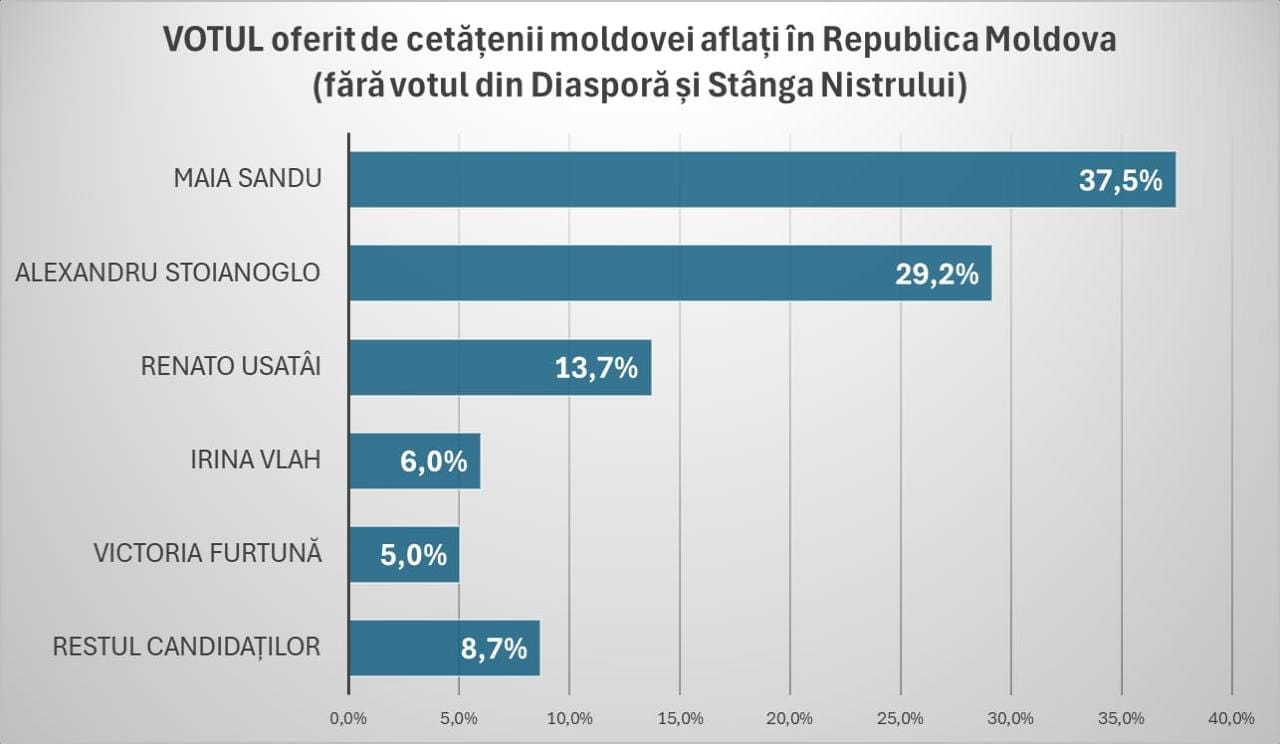 La alegerile prezidențiale din 20 octombrie 2024, Maia Sandu a acumulat 42,45% din sufragii, iar Alexandr Stoianoglo - 25,98% din voturi. Cei doi vor lupta pentru fotoliul de șef al statului în turul II al scrutinului, care urmează să se desfășoare pe 3 noiembrie.
