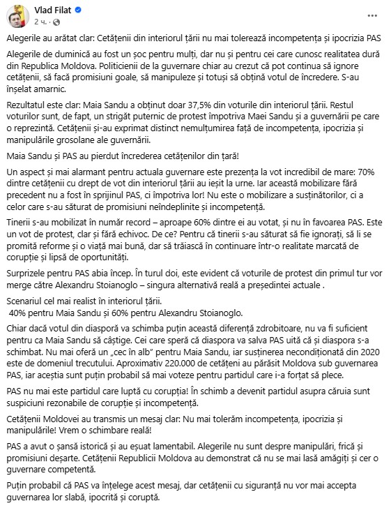 PAS a avut o șansă istorică și au eșuat lamentabil. Alegerile nu sunt despre manipulări, frică și promisiuni deșarte. Cetățenii Republicii Moldova au demonstrat că nu se mai lasă amăgiți și cer o guvernare competentă. Puțin probabil că PAS va înțelege acest mesaj, dar cetățenii cu siguranță nu vor mai accepta guvernarea lor slabă, ipocrită și coruptă”, a scris Vlad Filat.