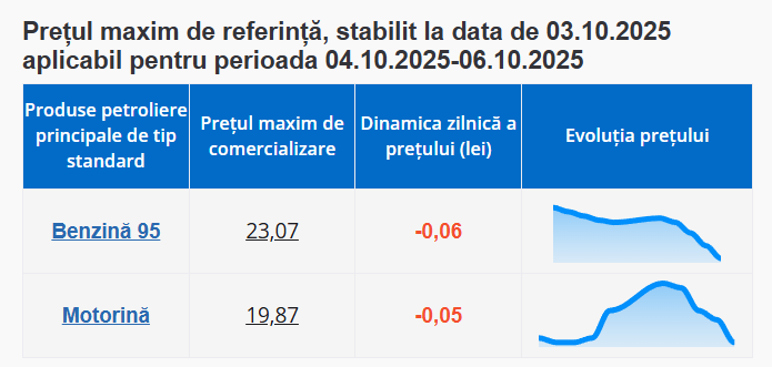 Prin urmare, pentru data de 04.10.2025 - 06.10.2025, ANRE a stabilit prețurile maximale de comercializare cu amănuntul a produselor petroliere principale de tip standard la nivelul de: