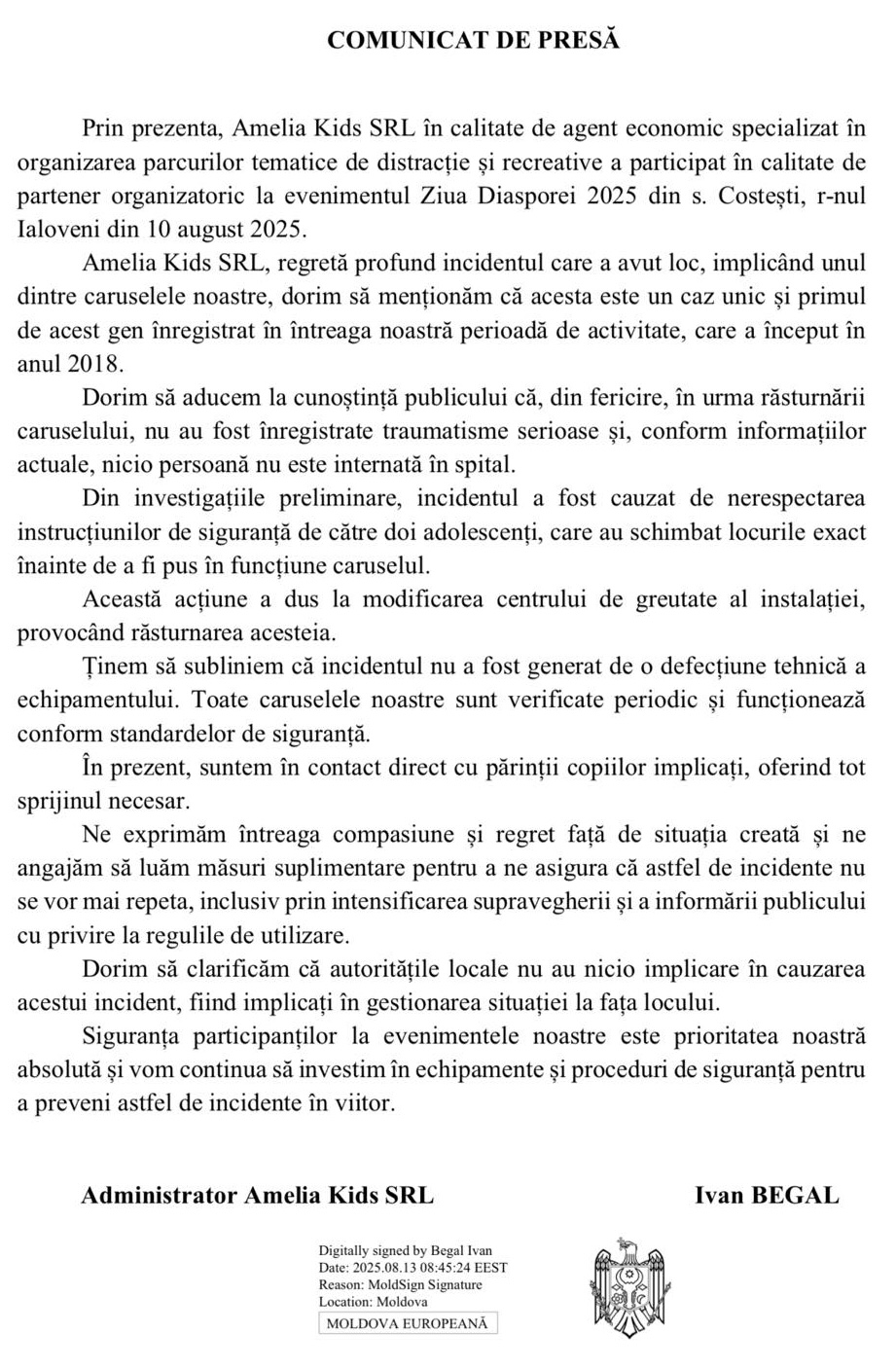 „Amelia Kids SRL, regretă profund incidentul care a avut loc, implicând unul dintre caruselele noastre, dorim să menționăm că acesta este un caz unic și primul de acest gen înregistrat în întreaga noastră perioadă de activitate, care a început în anul 2018. Dorim să aducem la cunoștință publicului că, din fericire, în urma răsturnării caruselului, nu au fost înregistrate traumatisme serioase și, conform informaţiilor actuale, nicio persoană nu este internată în spital.