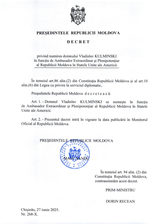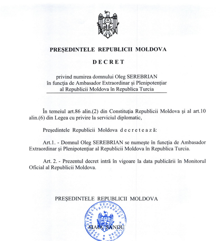 Astfel, prin decretele semnate de șefa statului, vicepremierul pentru Reintegrare, Oleg Serebrian, a fost numit oficial ambasador al Republicii Moldova în Turcia, iar fostul consilier al peședintei Maia Sandu, directorul Institutului pentru Inițiative Strategice, Vlad Kulminski - ambasador în SUA.
