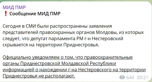 „Informăm oficial că organele de drept ale Republicii Moldovenești Nistrene nu dețin informații despre prezența domnului Nesterovschi pe teritoriul Transnistriei”, a transmis așa-numitul minister de Externe al regiunii.