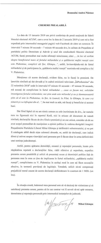 Mai mult, Ghimpu îi cere lui Năstase să se dezică de victimizare și să îi plătească prejudicii morale de 1 leu, în caz contrar îl va acționa în judecată.