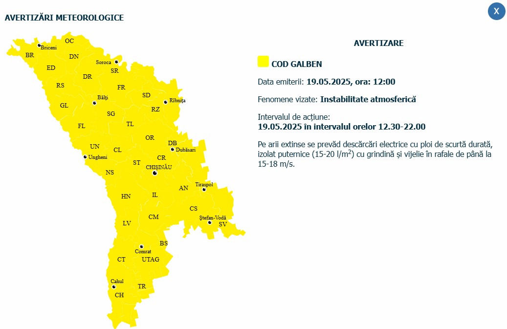 „Pe arii extinse se prevăd descărcări electrice cu ploi de scurtă durată, izolat puternice (15-20 l/m2) cu grindină și vijelie în rafale de până la 15-18 m/s”, anunță meteorologii.