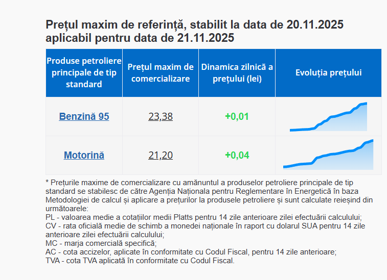 Agenția Națională pentru Reglementare în Energetică (ANRE) a stabilit noile prețuri maximale de referință pentru carburanți, valabile pentru 21 noiembrie 2025.