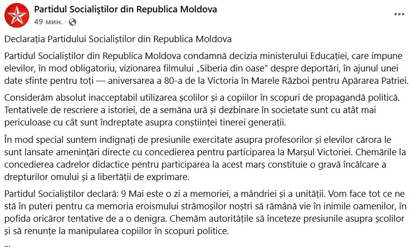 „Partidul Socialiștilor din Republica Moldova condamnă decizia ministerului Educației, care impune elevilor, în mod obligatoriu, vizionarea filmului „Siberia din oase” despre deportări, în ajunul unei date sfinte pentru toți — aniversarea a 80-a de la Victoria în Marele Război pentru Apărarea Patriei.