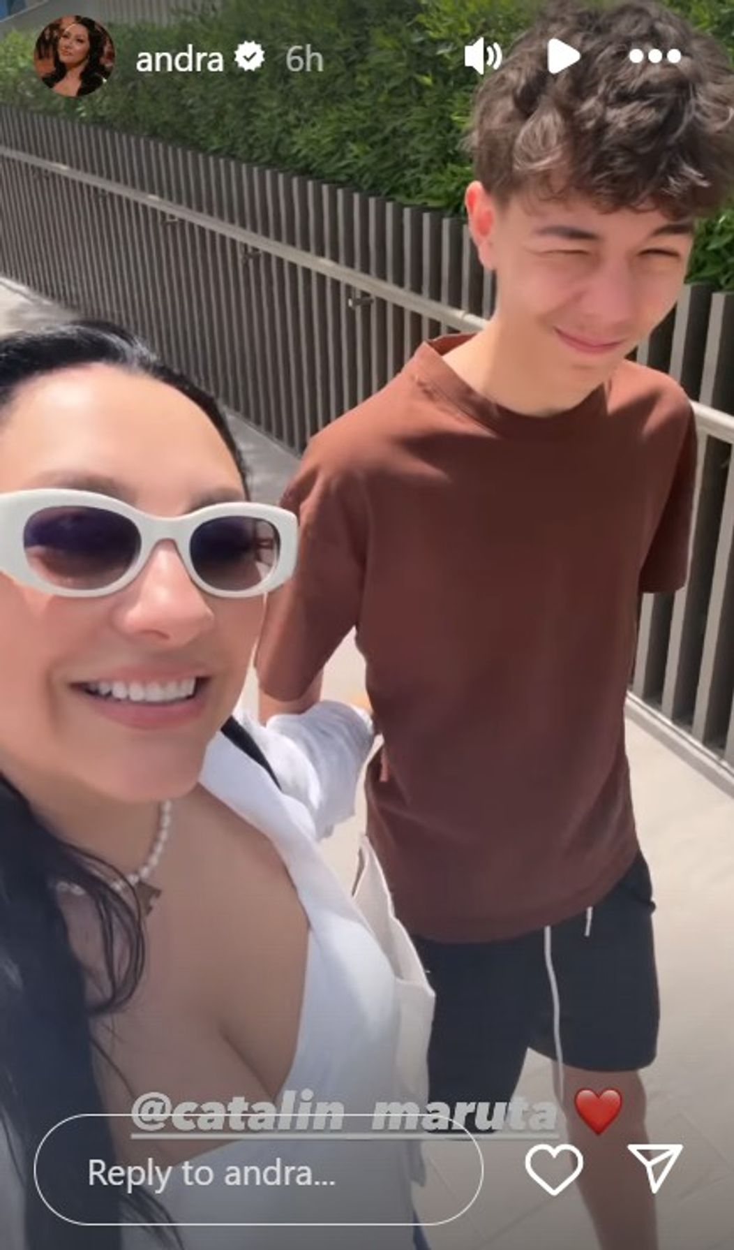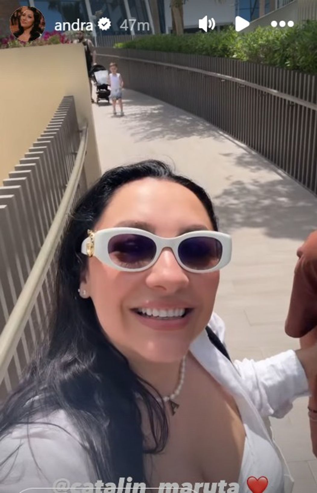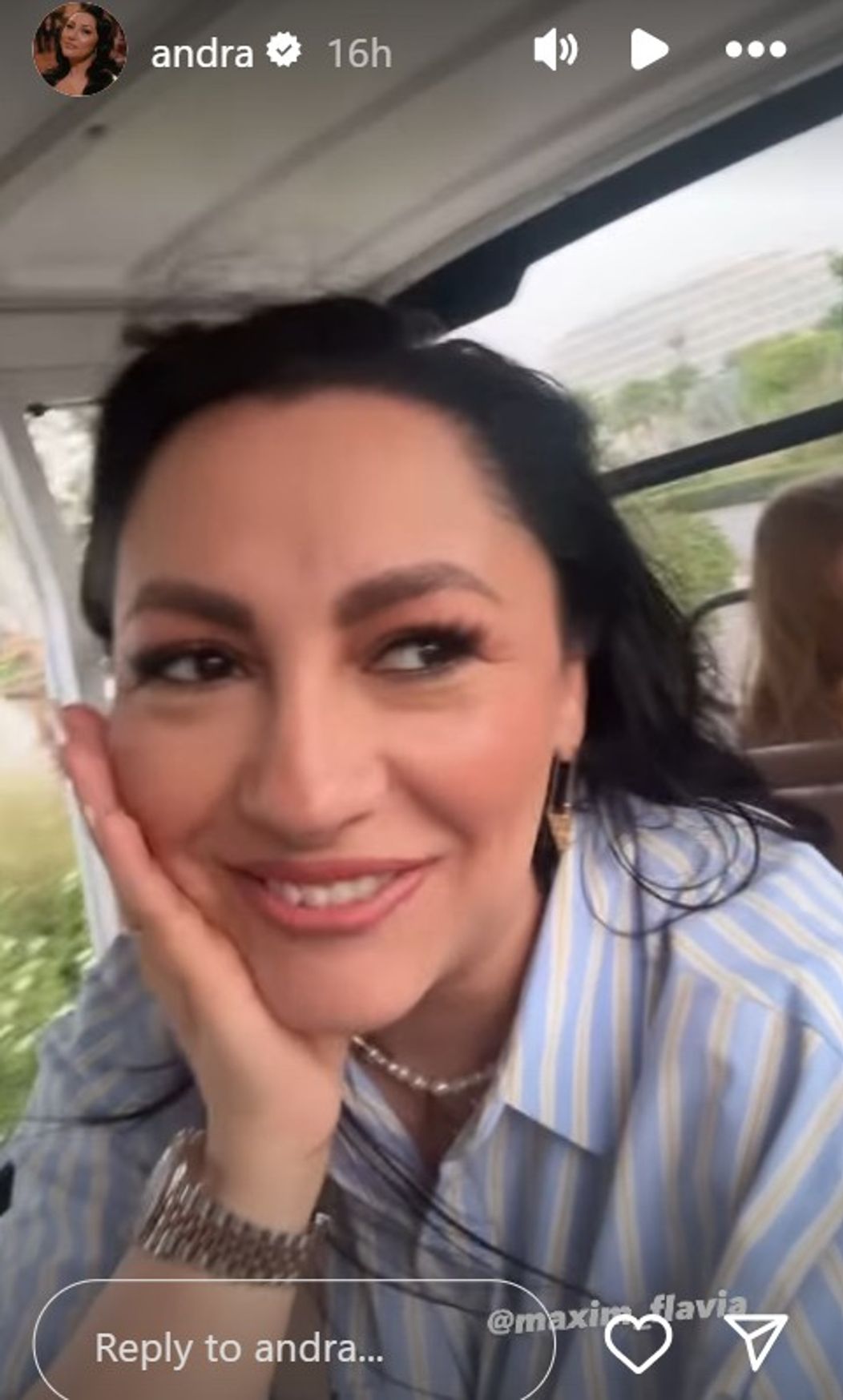 Andra menține o relație strânsă cu fanii săi pe rețelele sociale. Artista a postat imediat câteva filmulețe după ce a ajuns în Dubai: „În sfârșit pot să vă fac un story. Am ajuns în vacanță. Mă simt un pic vinovată că soțul meu încă nu a ajuns aici, pentru că e la emisiune. Eu sunt aici cu copiii, cu mama soacră și cu prietenii noștri.”