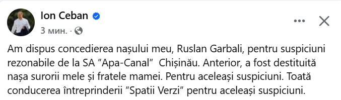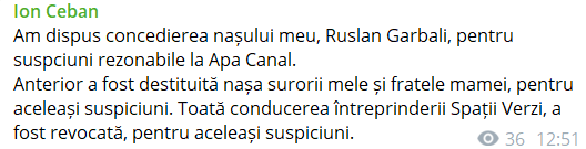 Anterior, a fost destituită nașa surorii mele și fratele mamei, pentru aceleași suspiciuni. Toată conducerea întreprinderii Spații Verzi, a fost revocată, pentru aceleași suspiciuni”, a scris Ion Ceban.