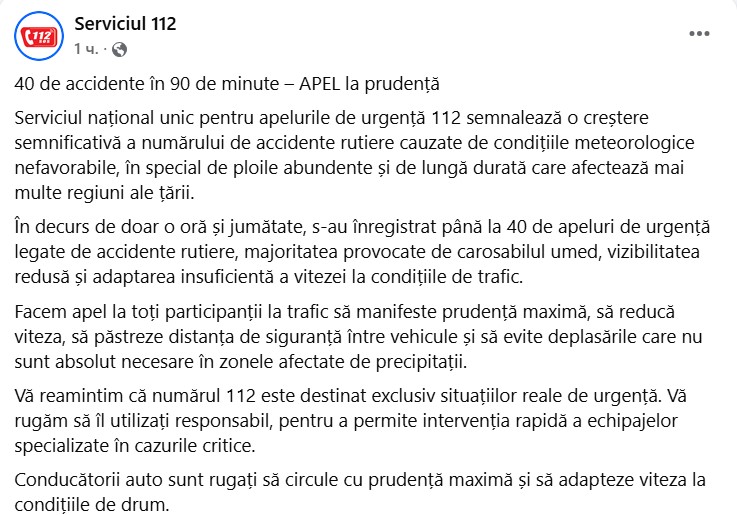 „În decurs de doar o oră și jumătate, s-au înregistrat până la 40 de apeluri de urgență legate de accidente rutiere, majoritatea provocate de carosabilul umed, vizibilitatea redusă și adaptarea insuficientă a vitezei la condițiile de trafic.