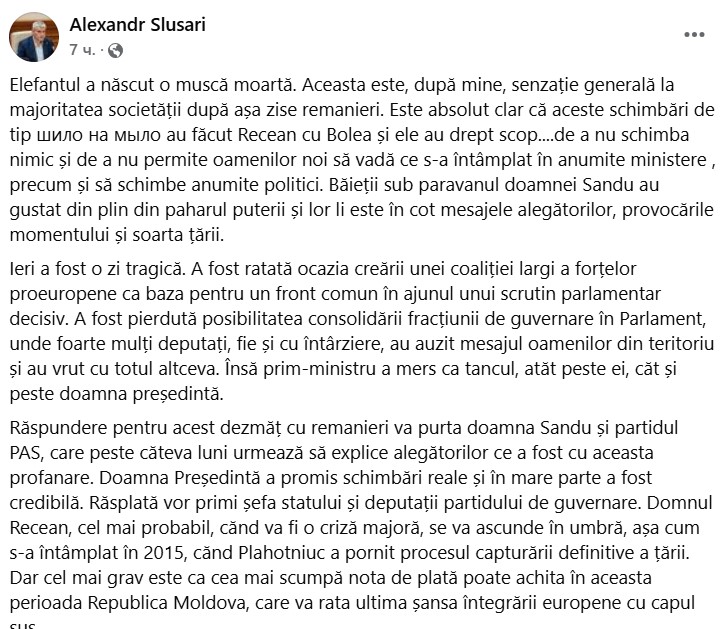 Răspunderea pentru acest dezmăț cu remanieri o va purta doamna Sandu și partidul PAS, care peste câteva luni urmează să explice alegătorilor ce a fost cu aceasta profanare. Doamna Președintă a promis schimbări reale și în mare parte a fost credibilă. Răsplata o vor primi șefa statului și deputații partidului de guvernare. Domnul Recean, cel mai probabil, când va fi o criză majoră, se va ascunde în umbră, așa cum s-a întâmplat în 2015, când Plahotniuc a pornit procesul capturării definitive a țării. Dar cel mai grav este că cea mai scumpă nota de plată o va achita, în aceasta perioada crucială, vectorul european al Republicii Moldova”, a scris Alexandr Sluari.