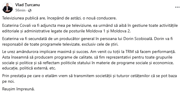 „Televiziunea publică are, începând de astăzi, o nouă conducere. Ecaterina Covali va fi adjuncta mea pe televiziune, ea urmând să aibă în gestiune toate activitățile editoriale și administrative legate de posturile Moldova 1 și Moldova 2.