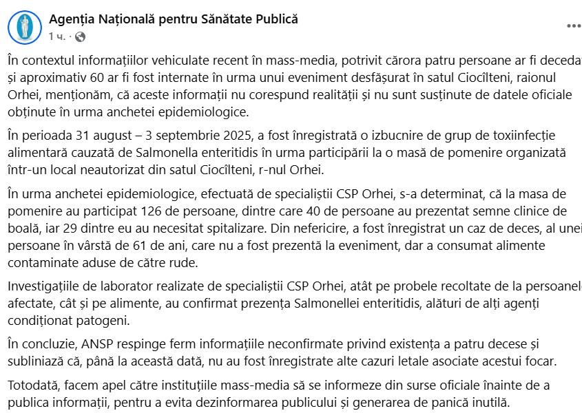 „În perioada 31 august – 3 septembrie 2025, a fost înregistrată o izbucnire de grup de toxiinfecție alimentară cauzată de Salmonella enteritidis în urma participării la o masă de pomenire organizată într-un local neautorizat din satul Ciocîlteni, r-nul Orhei.