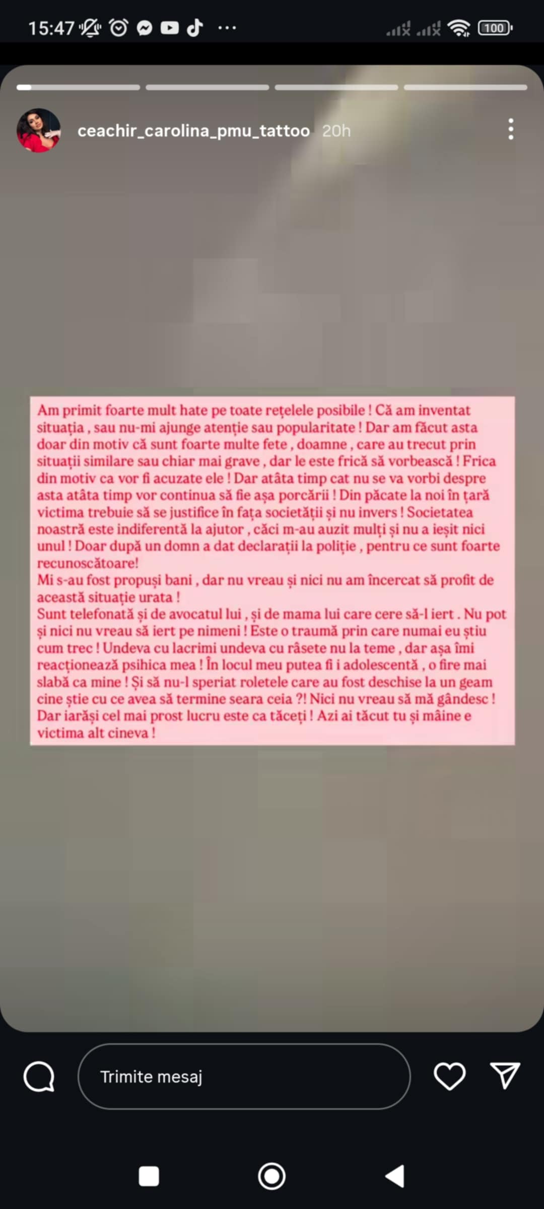 Și mama presupusului agresor i-a scris Carolinei Ceachir: „Mi-au fost propuși bani, dar nu vreau și nici nu am încercat să profit de această situație. Sunt telefonată și de avocatul lui, și de mama lui, care cere să-l iert. Nu vreau și nici nu pot să iert. Este o traumă prin care numai eu știu cum trec. Azi taci tu și mâine victimă e altcineva”.