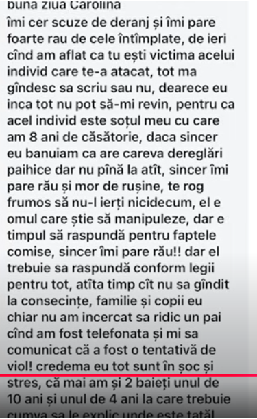 „Bună ziua, Carolina. Îmi cer scuze de deranj și îmi pare foarte rău pentru cele întâmplate. De când am aflat că tu ești victima acelui individ care te-a atacatm tot mă gândesc să scriu sau nu, deoarece eu încă tot nu pot să îmi revin, pentru că acel individ este soțul meu, cu care am 8 ani de căsătorie. Bănuiam că are dereglări psihice, dar nu până la atât. Sincer îmi pare rău și mor de rușine, te rog frumos să nu-l ierți nicidecum. El e omul care știe să manipuleze, dar e timpul să răspundă pentru faptele comise. Trebuie să răspundă conform legii pentru tot. Atât timp cât nu s-a gândit la consecințe, familie și copii, eu chiar nu am încercat să ridic un pai când am fost telefonată și mi s-a comunicat că a fost o tentativă de viol. Crede-mă, eu tot sunt în șoc, am și doi băieți, unul de 10 și unul de 4 anil, la care trebuie cumva să le explic unde este tatăl lor. Așa a vrut, așa a ieșit”, se menționează în scrisoarea pe care a primit-o Carolina pe Instagram.