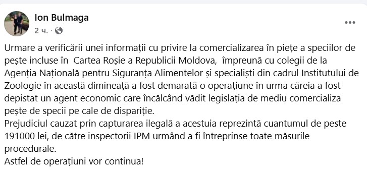 „Urmare a verificării unei informații cu privire la comercializarea în piețe a speciilor de pește incluse în Cartea Roșie a Republicii Moldova, împreună cu colegii de la Agenția Națională pentru Siguranța Alimentelor și specialiști din cadrul Institutului de Zoologie în această dimineață a fost demarată o operațiune în urma căreia a fost depistat un agent economic care încălcând vădit legislația de mediu comercializa pește de specii pe cale de dispariție.