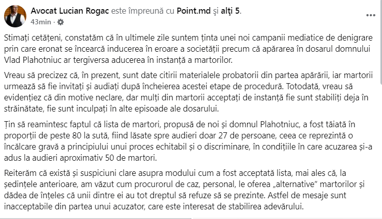 „Constatăm că în ultimele zile s-a întețit o campanie mediatică, ce pare a fi regizată, prin care se încearcă, din nou, să fie pusă într-o lumină proastă apărarea în dosarul în care este vizat dl Vlad Plahotniuc. Printr-o abordare părtinitoare și fără a scoate în evidență subtilitățile procesului referitoare la strategia apărării, ni se impută neargumentat că nu aducem în fața completului de judecată martorii apărării. Precizăm că, în prezent, se dau citirii materialelor probatorii din partea apărării”, a scris Lucian Rogac.