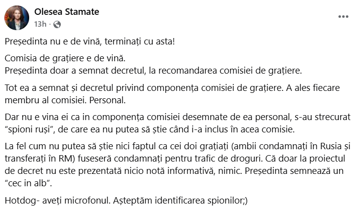 Hotdog - aveți microfonul. Așteptăm identificarea spionilor”, a scris Olesea Stamate.