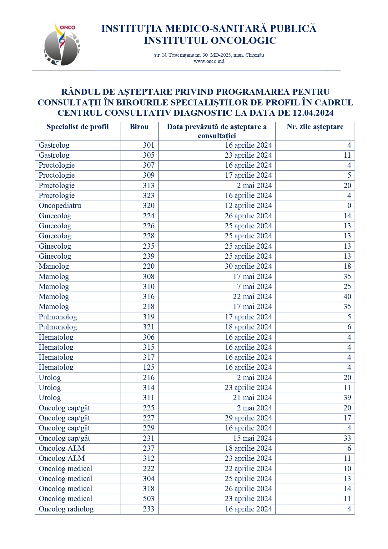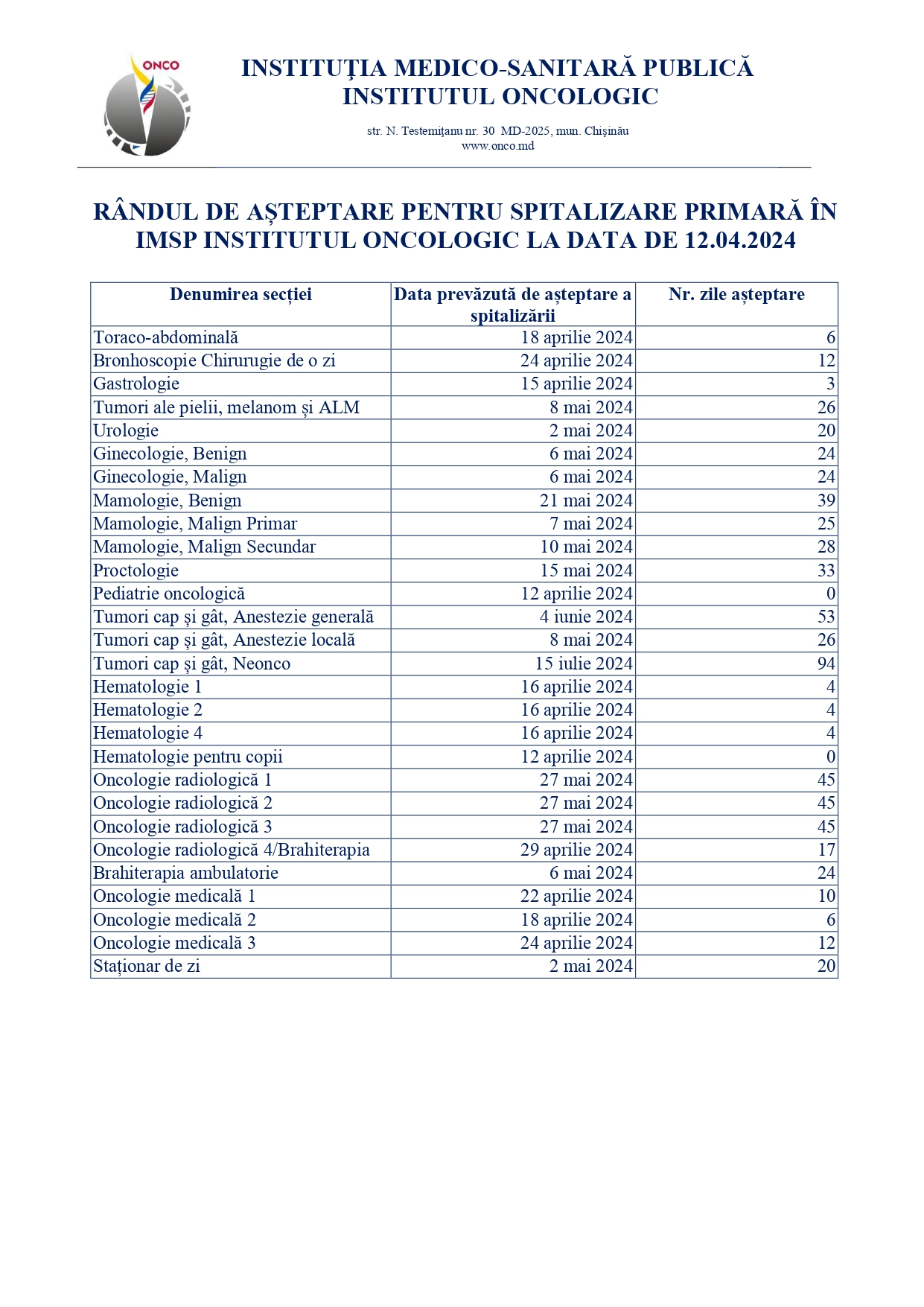 Între 3 și 94 de zile trebuie să aștepte un pacient pentru a beneficia de o consultație sau pentru a fi internat la Institutul Oncologic din Moldova. Datele au fost prezentate de reprezentanții spitalului, care au publicat informația actualizată despre programările pentru spitalizare primară și consultațiile în birourile specialiștilor de profil în cadrul Centrului Consultativ Diagnostic.