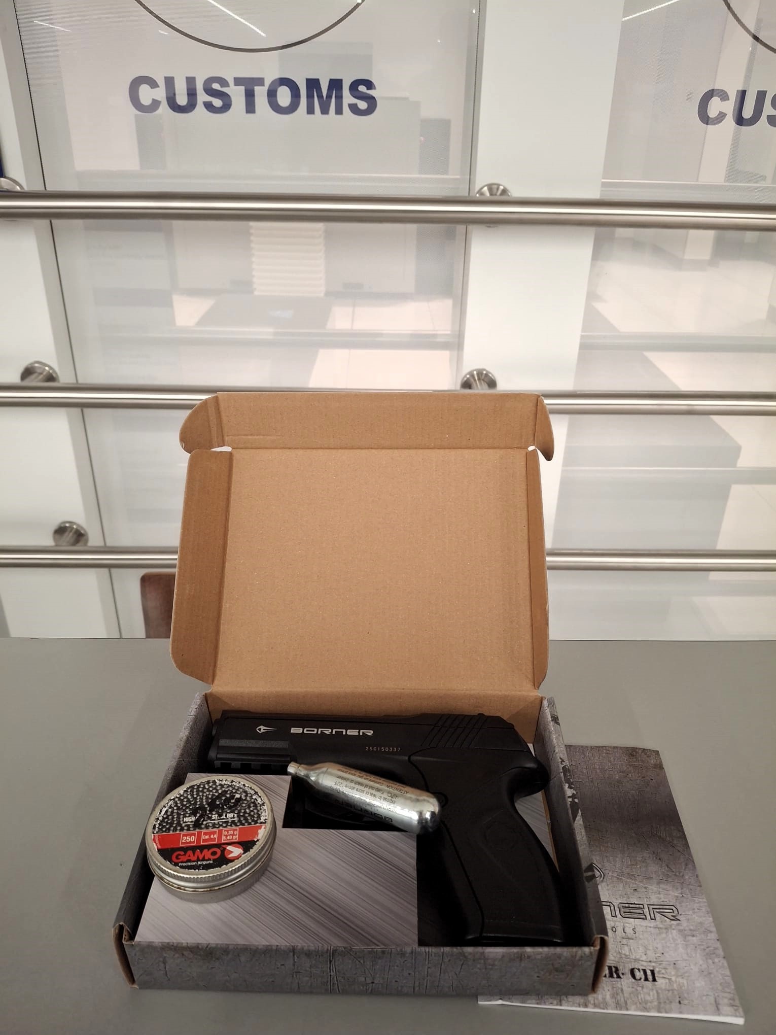 În urma verificărilor amănunțite ale bagajelor celor doi nerezidenți, un tânăr în vârstă de 20 de ani, cetățean israelian, a fost găsit în posesia unui pistol pneumatic, a unui recipient cu gaz și a unei cutii metalice cu bile, fără a le declara conform procedurilor vamale.