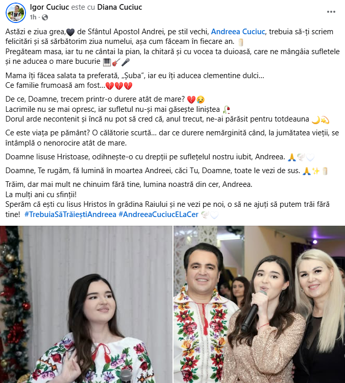 „Astăzi e ziua grea, de Sfântul Apostol Andrei, pe stil vechi, Andreea Cuciuc, trebuia să-ți scriem felicitări și să sărbătorim ziua numelui, așa cum făceam în fiecare an.