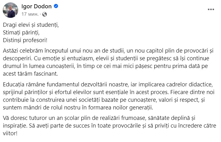 Vă doresc tuturor un an școlar plin de realizări frumoase, sănătate deplină și inspirație. Să aveți parte de succes în toate provocările și să priviți cu încredere către viitor”, a scris fostul președinte.