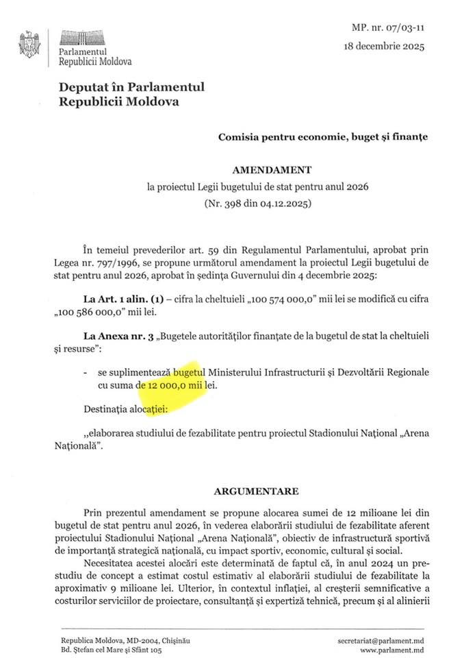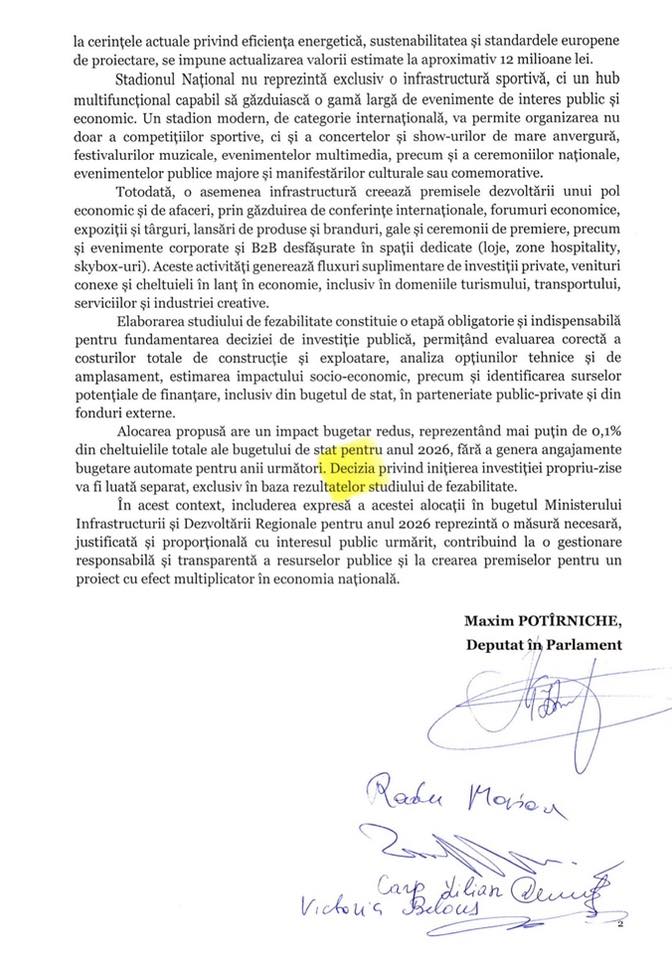 „Urmează să primim acceptul de la Ministerul Finanțelor, după care vom vota Legea bugetului în lectura a II-a. Studiul de fezabilitate este o un document, o hârtie de turnesol a unui obiectiv de infrastructură majoră, precum este Stadionul Național. El ne va arăta costul total al proiectului, capacitatea necesară de locuri pe stadion, timpii de construcție și cel mai important - metoda optimă de finanțare a acestui proiect”
