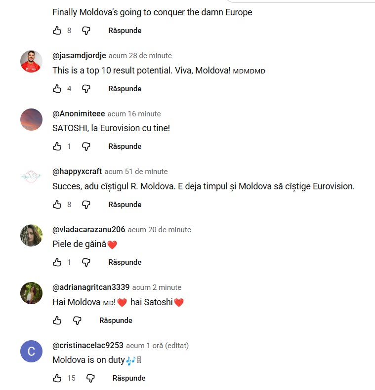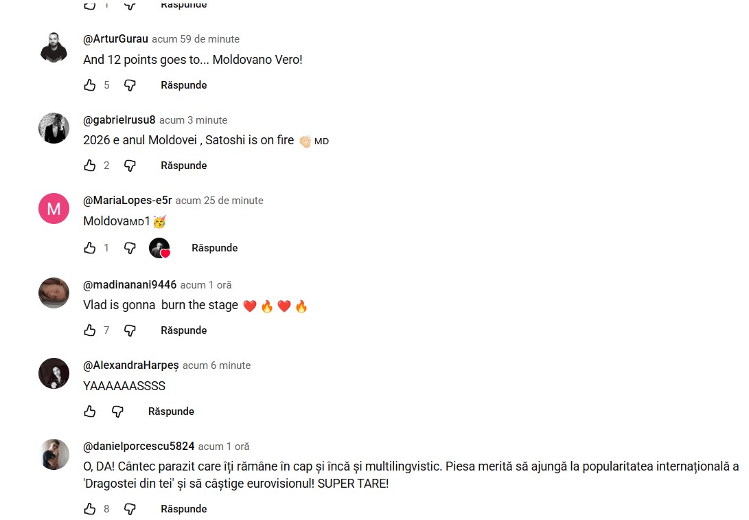 „Piele de găină”, // „Am spus de la bune începuturi și afirmația se confirmă: Satoshi - fenomen autohton”, // „E deja timpul și Moldova să câștige Eurovision”, //„2026 e anul Moldovei”, // „Cântec parazit, care îți rămâne în cap și încă și multilingvistic. Piesa merită să ajungă la popularitatea internațională a 'Dragostei din tei' și să câștige eurovisionul! Super tare”, au comentat internauții.