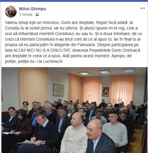 Mihai Ghimpu / Sursa:FacebookDe menționat că Valeriu Munteanu a anunțat în cadrul unei conferințe de presă faptul că se retrage din Partidul Liberal, menționând că „există totuși o decizie a PL de a participa de unii singuri la alegeri și nu este o minciună așa cum a scris aseară domnul Chirtoacă”.