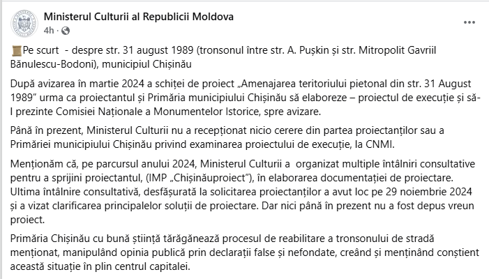 Primăria Chișinău cu bună știință tărăgănează procesul de reabilitare a tronsonului de stradă menționat, manipulând opinia publică prin declarații false și nefondate, creând și menținând conștient această situație în plin centrul capitalei”, scrie Ministerul Culturii.